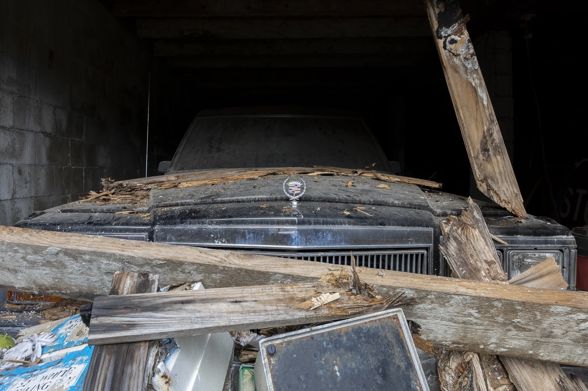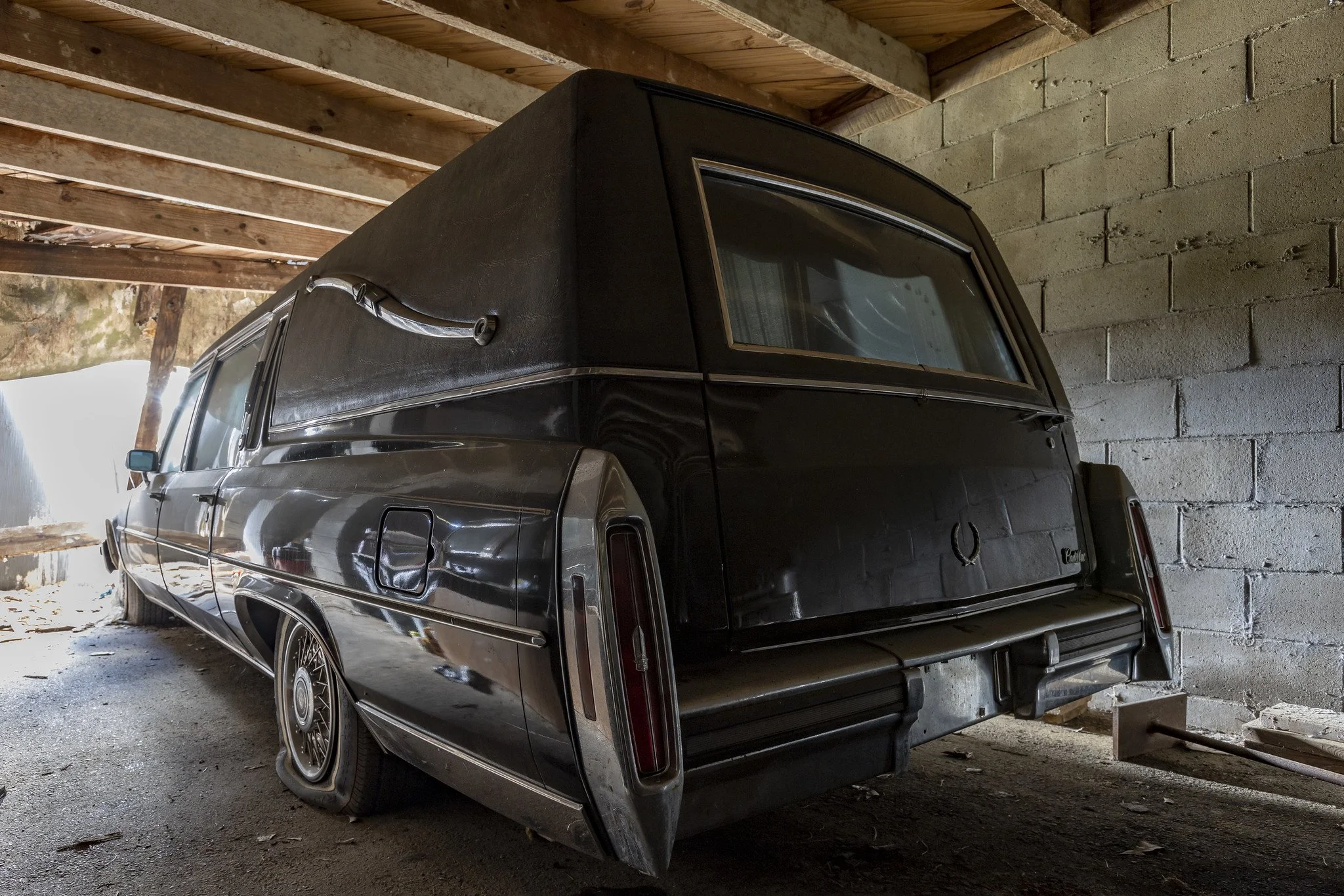 After the father passed away, the old funeral home was left abandoned with lots left behind for us to explore. Most notable was the casket display room, with approximately five different caskets, burial outfits and dresses, and some random floral arrangements. The funeral chapel was tiny and really only had enough room for a few rows of chairs, the podium, and the casket pedestal. There was some portraits and funeral announcements for a Miss Nancy still hanging on the wall, as well as a few outdated obituaries scattered about. Unfortunately and to our disappointment, the embalming room was completed empty. But just before leaving the funeral home, we noticed that the garage door was open so we went to see if there was anything in there. To our complete shock, surprise, and of course pleasure, there was a nice set of twin old school Cadillac hearses still chillin inside. That was surely a great addition to this tiny little funeral home.