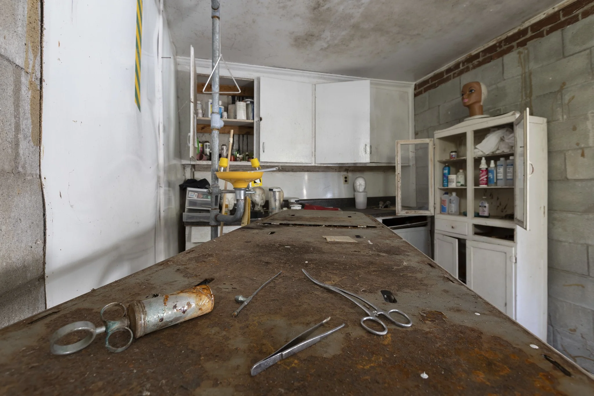 This abandoned funeral home was established in 1955. The funeral home was highly successful for many decades but in 2012, the owner fell Ill and passed away so it now sits abandoned. Exploring this place was both a thrill and an adrenaline rush. It was a thrill because they left a lot of the funeral preparation and embalming products behind including, used needles, hemostats, razors, mannequin heads, cavity fluid, tissue solvent, and embalming powder. They also left behind a few caskets, some burial vaults, as well as old death records and outdated obituaries.