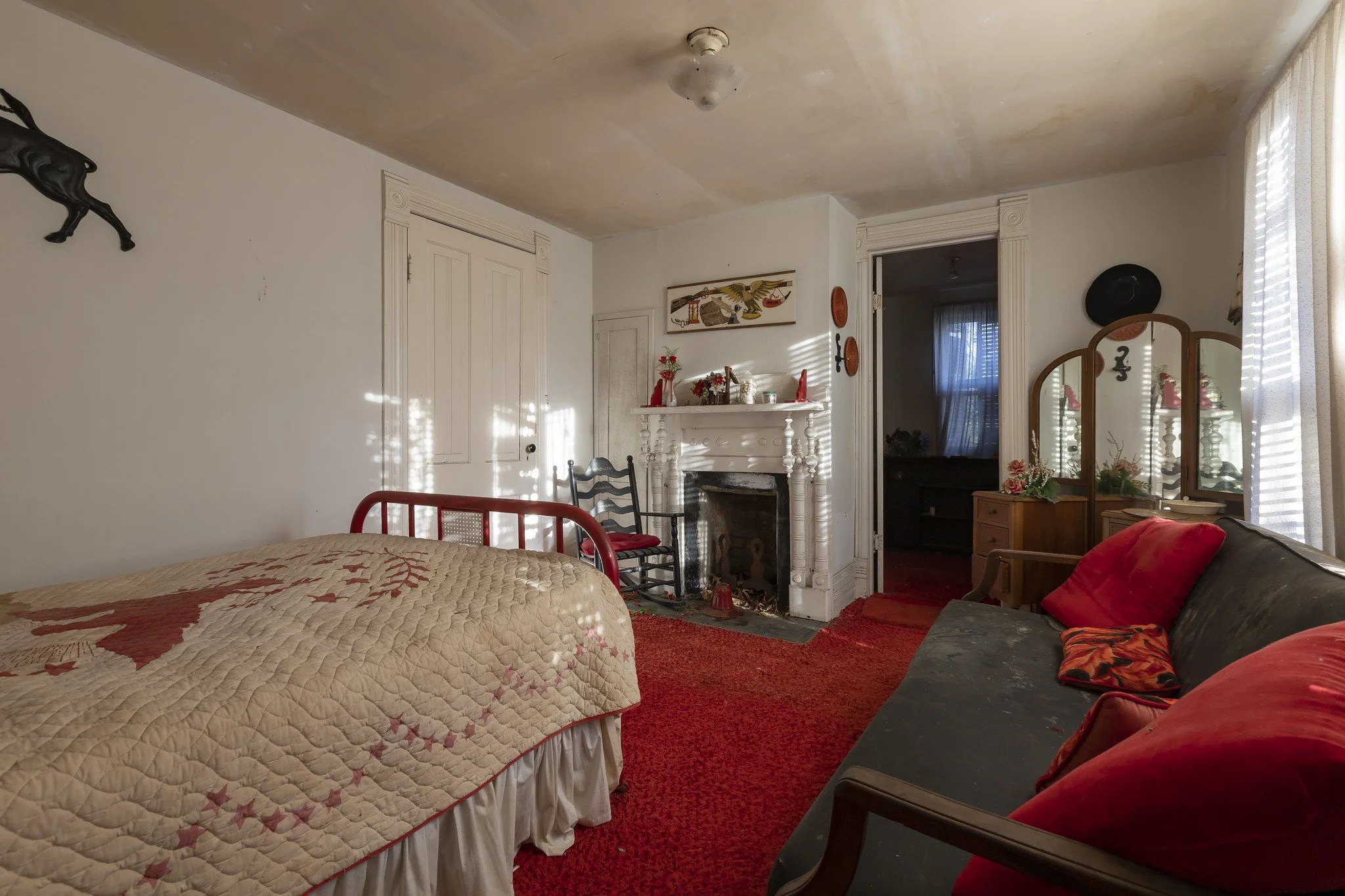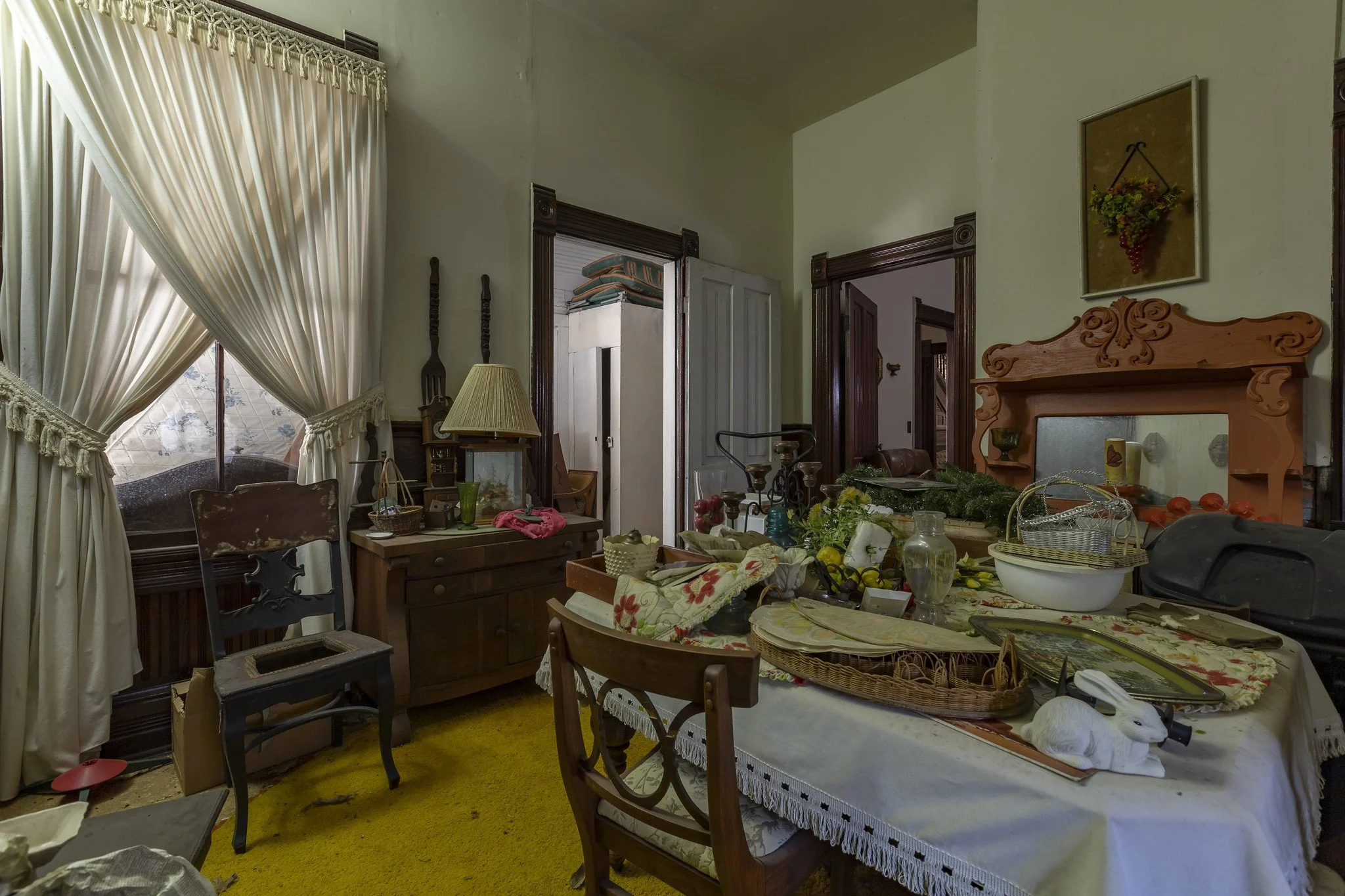 Although most of the bedrooms, the kitchen, and the dining room were all still set up from the last family that lived here, the front parlor rooms were filled with more antique furniture, almost as if it was last used for storage. The front of the home still featured the original second-story screened-in porch that wrapped around the corner of the home. On the porch, we found an old swinging chair still hanging, along with several matching rocking chairs and other outdoor seating.
